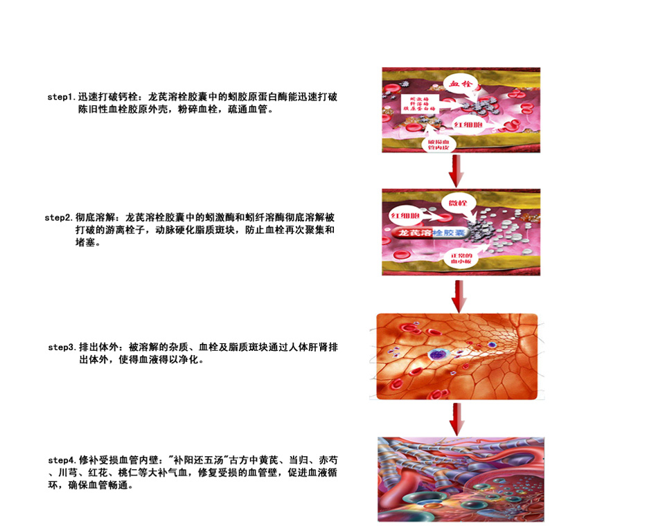 普通藥物只能溶解部分血栓,但對(duì)于血栓溶解后形成的眾多微栓卻無(wú)能為力!而龍芪溶栓膠囊中的蚓激酶、蚓膠原蛋白酶和蚓纖溶酶能徹底溶解粉碎后的微栓,組方的黃芪、當(dāng)歸等中藥成分能有效地對(duì)受損血管壁進(jìn)行修復(fù),達(dá)到血管健康,身體健康!